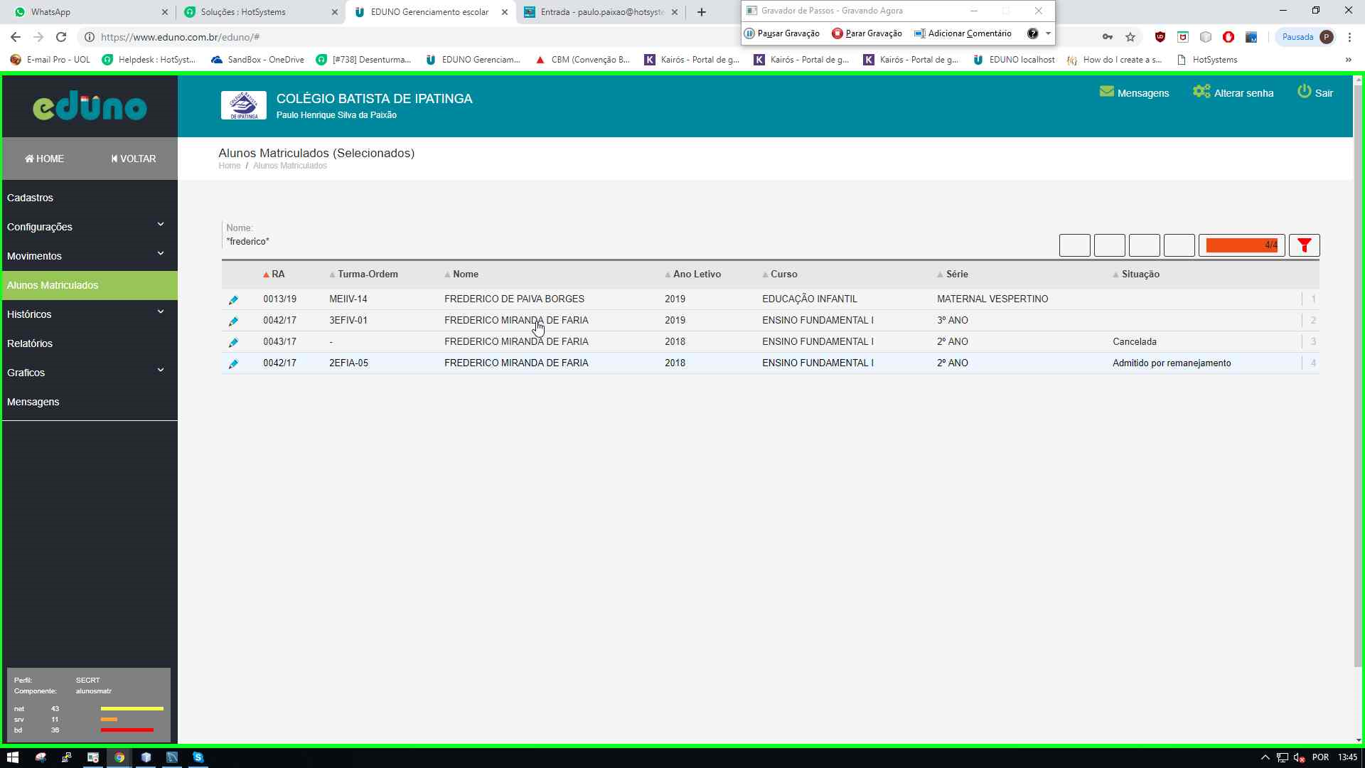 2 -Pesquise o aluno utilizando o filtro e em seguida selecione o mesmo clicando sobre o nome do mesmo: