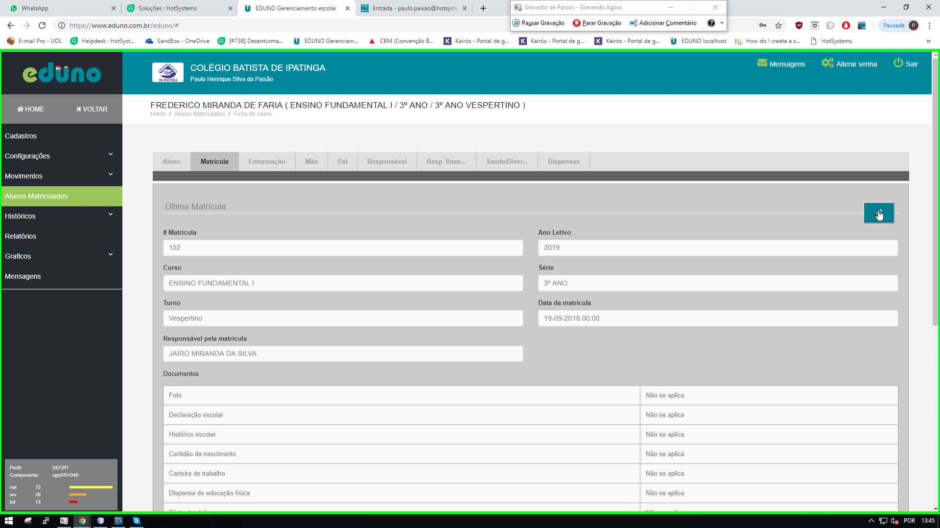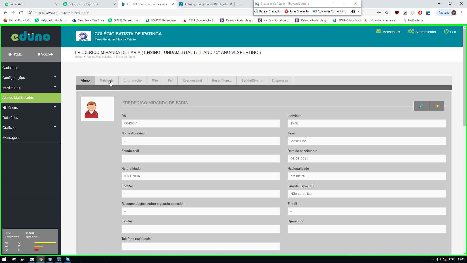 3 - Após realizado o passo 2, serão mostrados os dados do aluno separados/classificados em abas conforme abaixo. Selecionamos a aba Matrícula.